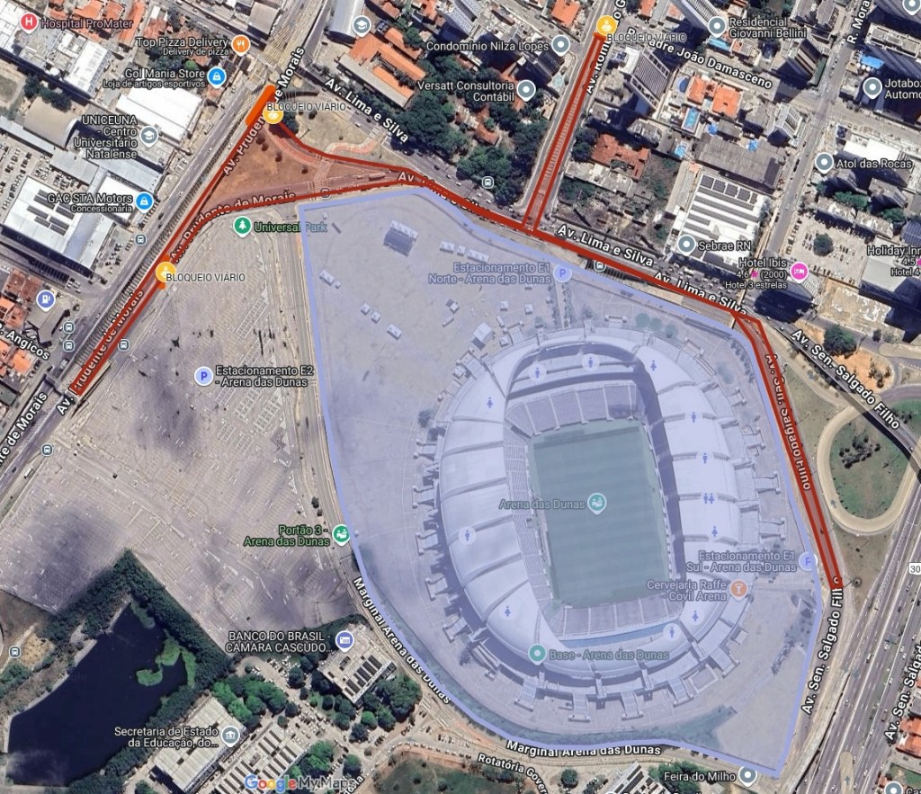 Segundo a STTU, as interdições no entorno do estádio terão início às 17h e seguirão até às 23h. O bloqueio abrangerá trechos das avenidas Lima e Silva e Prudente de Morais, conforme croqui elaborado pelo setor de operações.